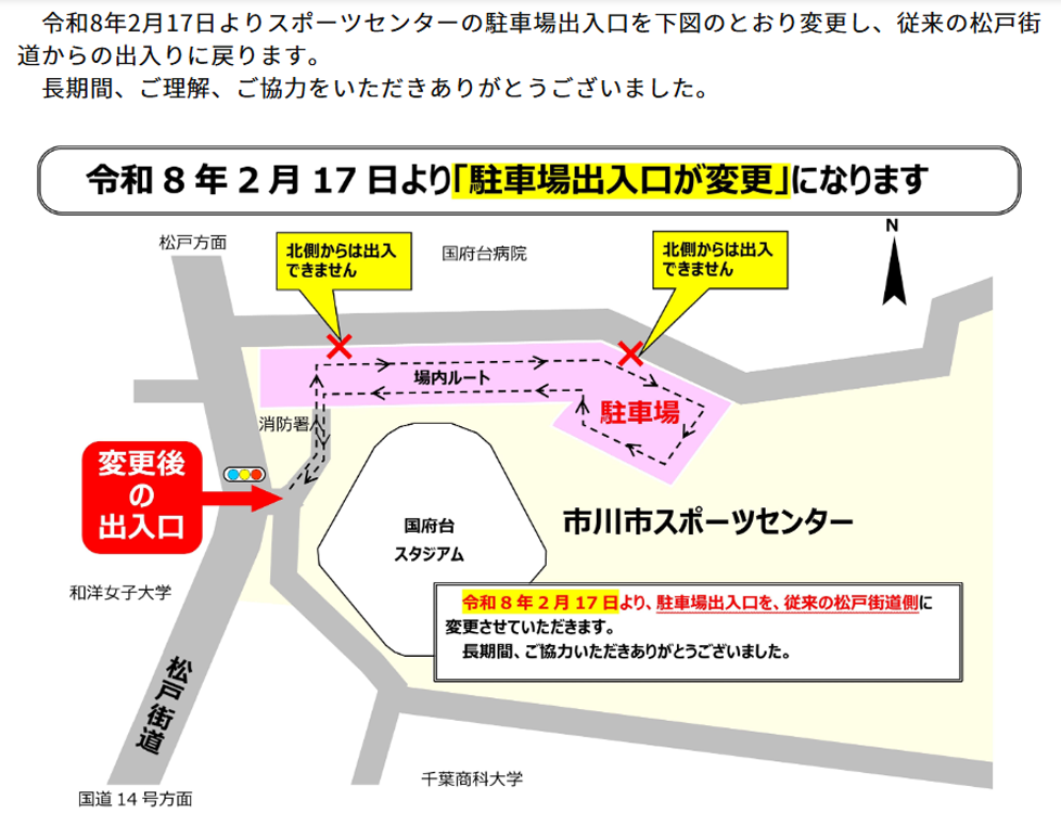 2026/04/14 | 国府台体育館駐車場出入り口が従来の松戸街道側に戻っています。 臨時出入り口は閉鎖されていますのでご注意ください。 地図はこちら |